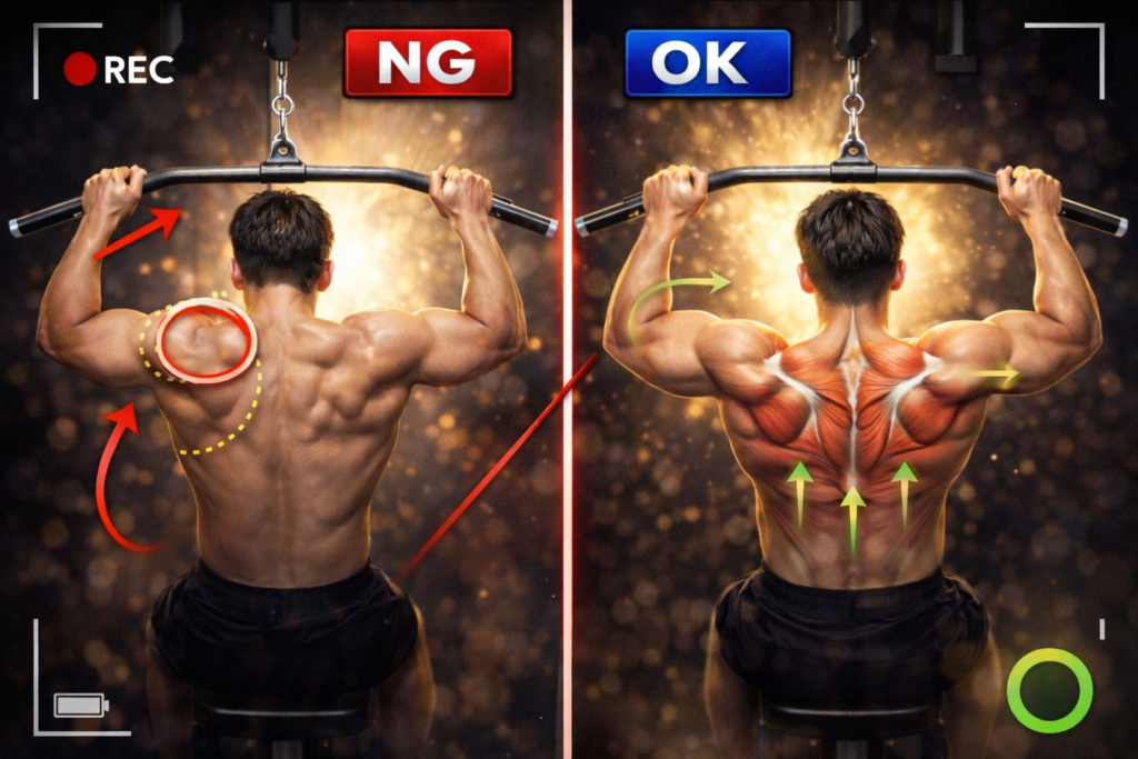 ・体が後ろに倒れすぎている: 体重で引いているだけで、筋肉の収縮が起きていません。